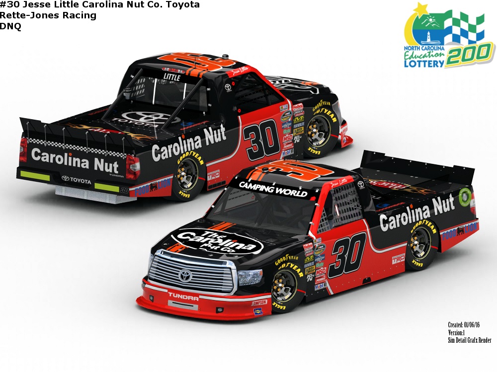 Jesse Little's 30 that DNQ'd at Charlotte. Credits: Om3ga for template, BER for car number, simdetailgrafx for base, paint by rah base(contigs also), google for logos, dafont for Little's door font. simdetailgrafx's SDG_TBX12 for the render. And I put the font and race name afterwards.