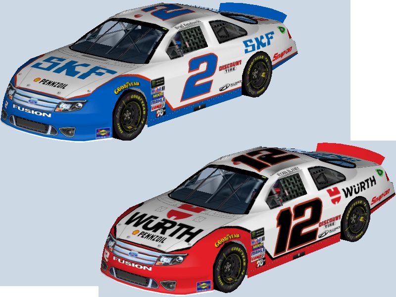 NASCAR Fantasy Cup League Silly Season update: Team Penske expands to 3 cars for the 2018 season, with Ryan Blaney joining the fold in the #12 Ford. This car set includes 2 fictional paints - #2 SKF Ford driven by Brad Keselowski & #12 Wurth Ford driven by Ryan Blaney. (Note: I am using Joey Logano's #22 Pennzoil Ford from Dusty9's 2013 carset in my roster, so no new paint for Logano.) Credits: Google - numbers & logos; RCI - template & contigs; base - me