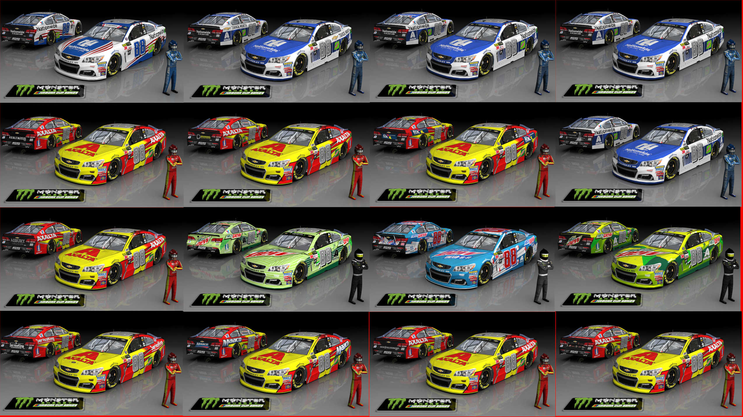 16 additional dale jr schemes for the mencs17 mod! bases:SDG(modified by me) Logos:Google Numbers:BER Templates:SNG Driver Suits And Pit Crews:SNG Renders;TMS
