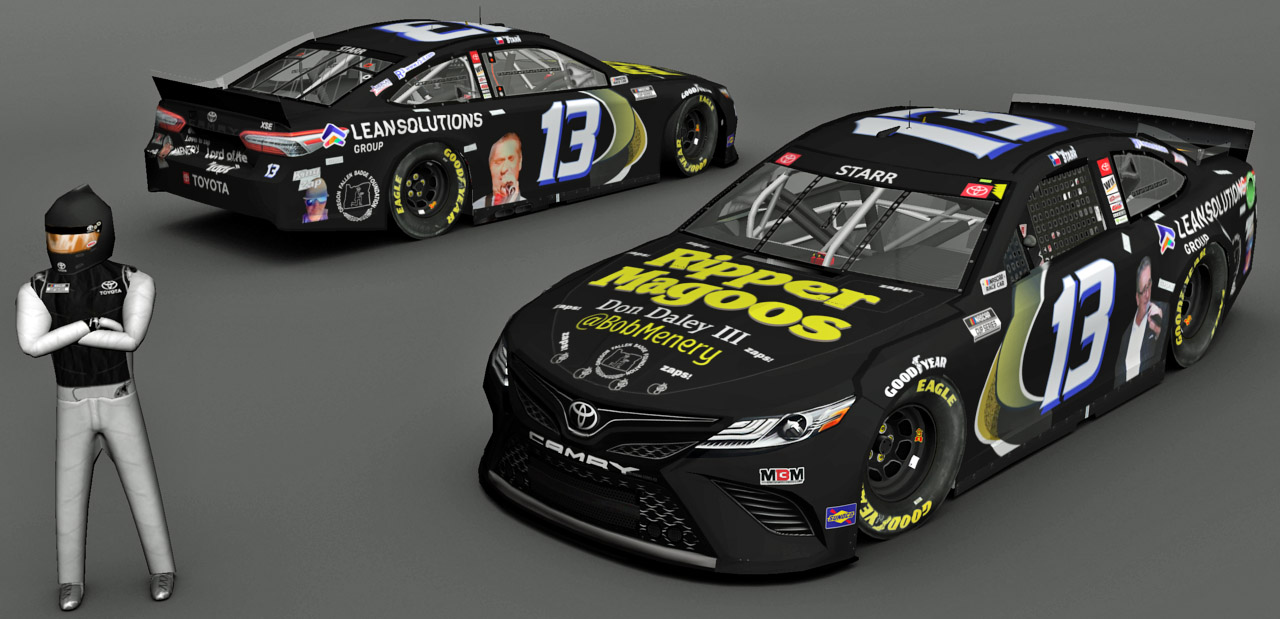2021 #13 David Starr from Nashville. MENCS 2019 mod & template - Splash n' Go with Lefty template update...... #'s - me...... B-pillar decals - Rick's 2021 B-Pillars and me...... Sponsor logos from various internet sites/me...... Pit crew - SteveZ ( modified )...... NRatings for driver rating...... Render - The Mod Squad......