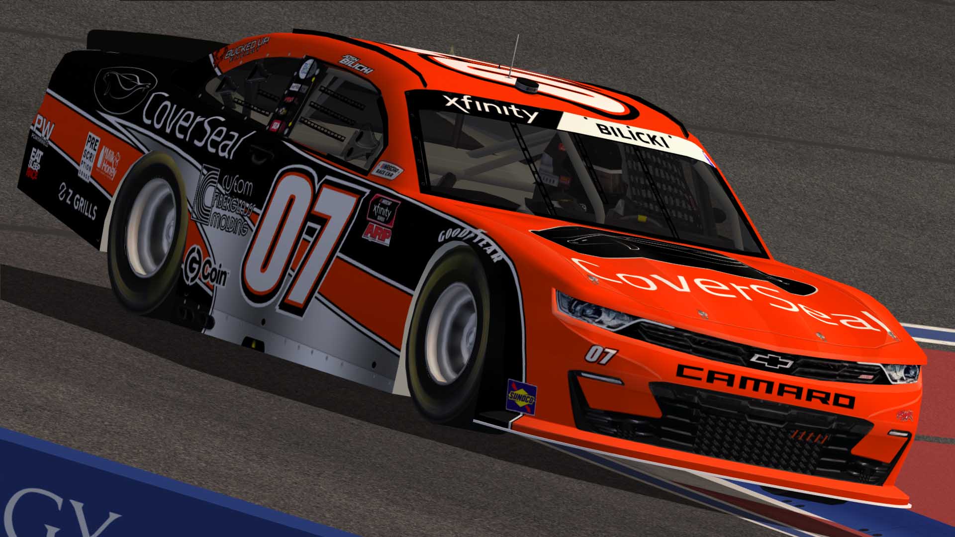 Josh Bilicki's #07 CoverSeal car that he drove in the 2021 Drive for the Cure 250 at the Charlotte Roval. Credits: Template: SRD Base: Myself, Eric Parks Logos: SS Green Light Racing Number: SS Green Light Racing Name Rail: SS Green Light Racing