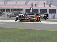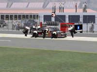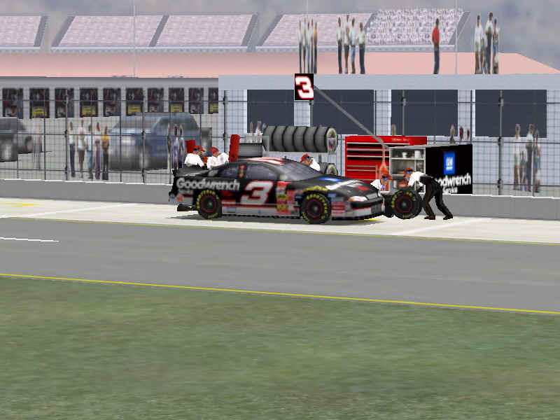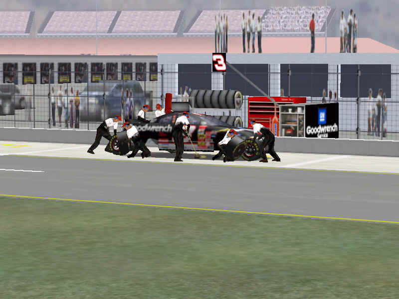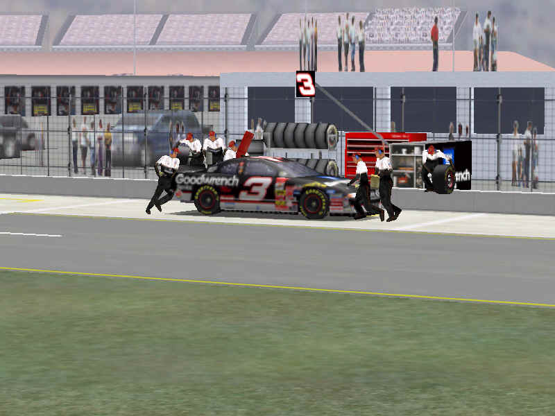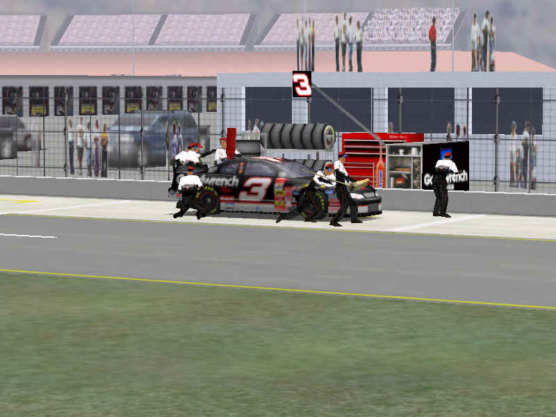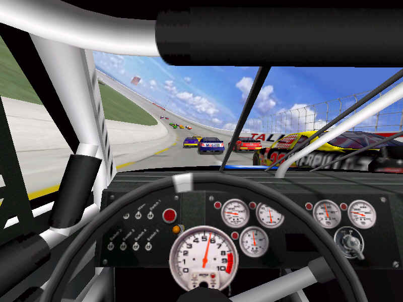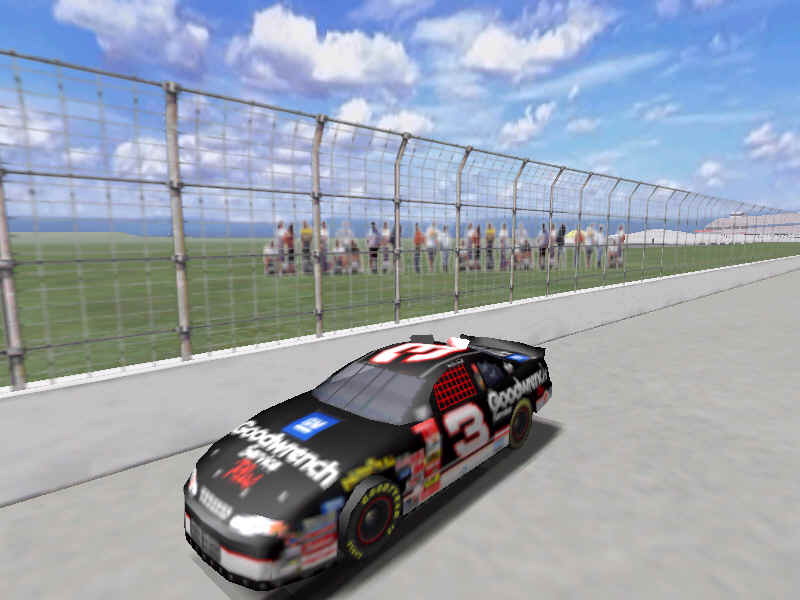Most would like to see an animated pit crew that services your car in record time, this is included. I have put a sequence of shots below that show the pit action. You see the crew members from every angle including the in car. Guys are running around and you can head the jack and air wrenches. The one thing I noticed missing was the winshield washer. Another added bit of realism is that of roof flaps. When you spin at an increased speed you can see your roof flaps deploy to keep you on the ground. I also included a shot of this as I spun backwards through the pre-pit entrance at Tally. The final two shot is just from some very close racing at Dega. While the physics model/AI reactions are not completely finished, this seems a little more realistic than previous sims. You can gently lay your car along side of another without losing control, just to move them out of the way, but if you hit them a little to hard, chances are you will meet in the wall. The shot I included is of me making a little room down low.
